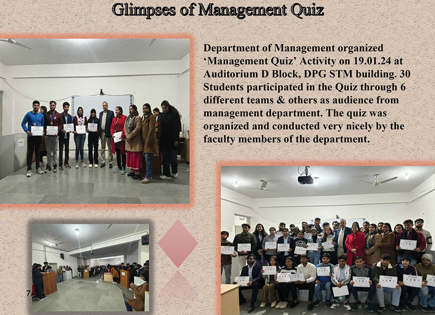 Quiz competition was organized by DPG School of Technology and Management, Gurugram on 21st June 2022.It was a three round competition which covers the areas of general knowledge, English vocabulary, and personality recognition rounds. There were six teams with six participants and gave a tough battle to each other in all the three rounds. It was a very informative and knowledge enriching competition for the participants along with the audience. Although, all the team actively participated, team C (students of BCA A section) and team B (students of BCA B section) bagged the first and the second position respectively.